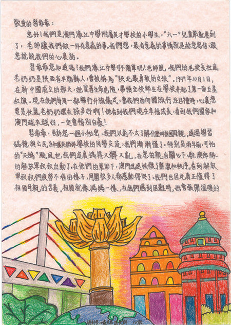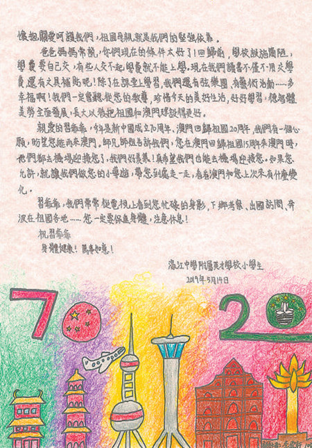 2019年5月31日,习近平给澳门濠江中学附属英才学校的小学生回信,对他们予以亲切勉励,并祝他们和全国的少年儿童节日快乐。