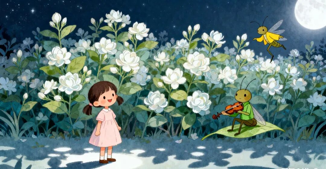月光照耀着花园,莉莉摘下了一朵茉莉花。“给你,甜美的梦礼物!”